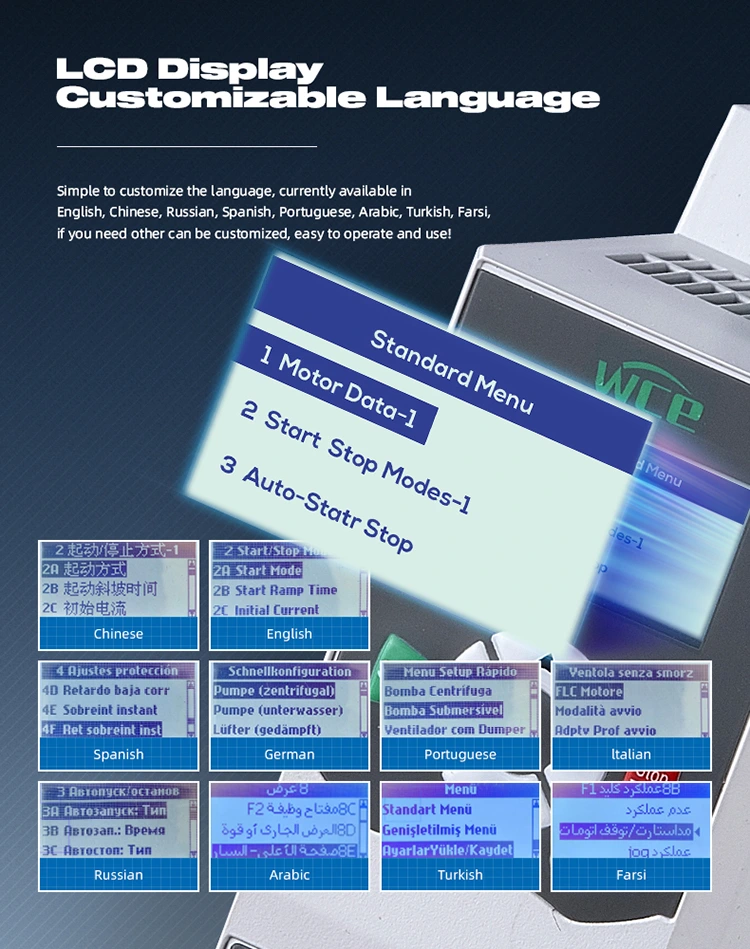 Arukas interaktsioon ja mugav töö: Sisseehitatud 380 V sisseehitatud pehme starter 1HP 0,75kW on varustatud LCD vedelkristallide kuvari ekraaniga. Liidese kujundus on lihtne ja intuitiivne ning töökogemus on sujuv ja mugav. Süsteem on varustatud nii hiina kui ka inglise keele kuvamisfunktsioonidega ning toetab konkreetsete riikide keelte kohandamist, mis vastab täielikult erinevates piirkondades kasutajate vajadustega.